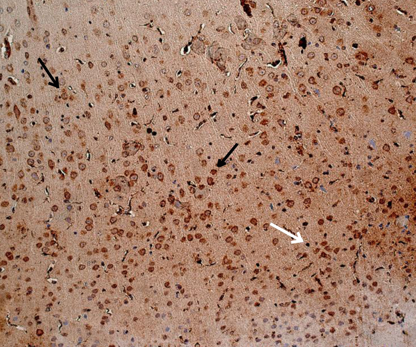 Рис. 2. Животное с СД1 без лечения (физраствор) – выраженная экспрессия ИРМ IL-6. Иммуногистохимическое исследование, антитела против IL-6. Увеличение ×200. Черные стрелки – экспрессия в неповрежденных нейронах. Белые стрелки – экспрессия в нейропиле