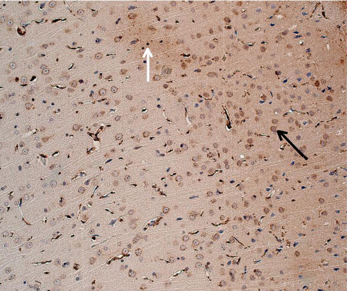 Рис. 4. Животное с СД1 (лечение – сукцикард) – от слабой до умеренной экспрессия ИРМ IL-6. Иммуногистохимическое исследование, антитела против IL-6. Увеличение ×200. Черные стрелки – экспрессия в неповрежденных нейронах. Белые стрелки – экспрессия в нейропиле
