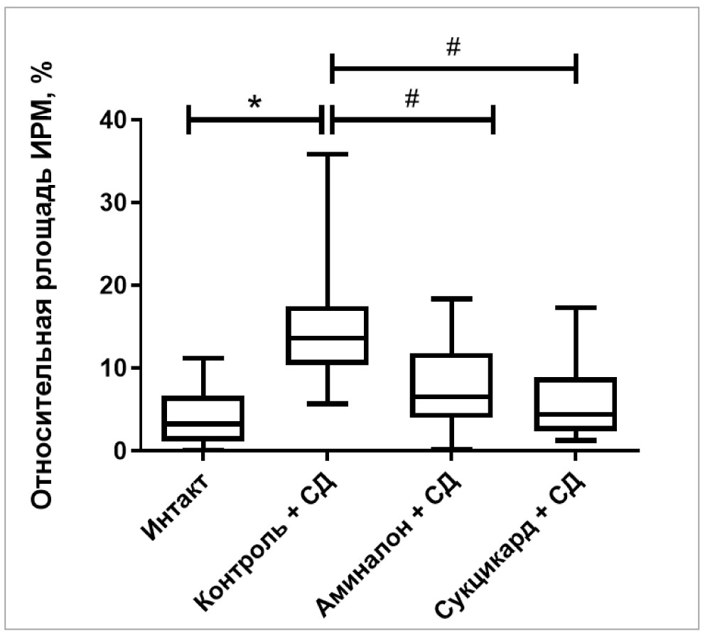 * Различия между группами СД1 и интакта статистически значимы (Anova-Тест), p < 0,01; # различия между группами СД1, аминалона и сукцикарда статистически значимы (Anova-Тест), p < 0,01.