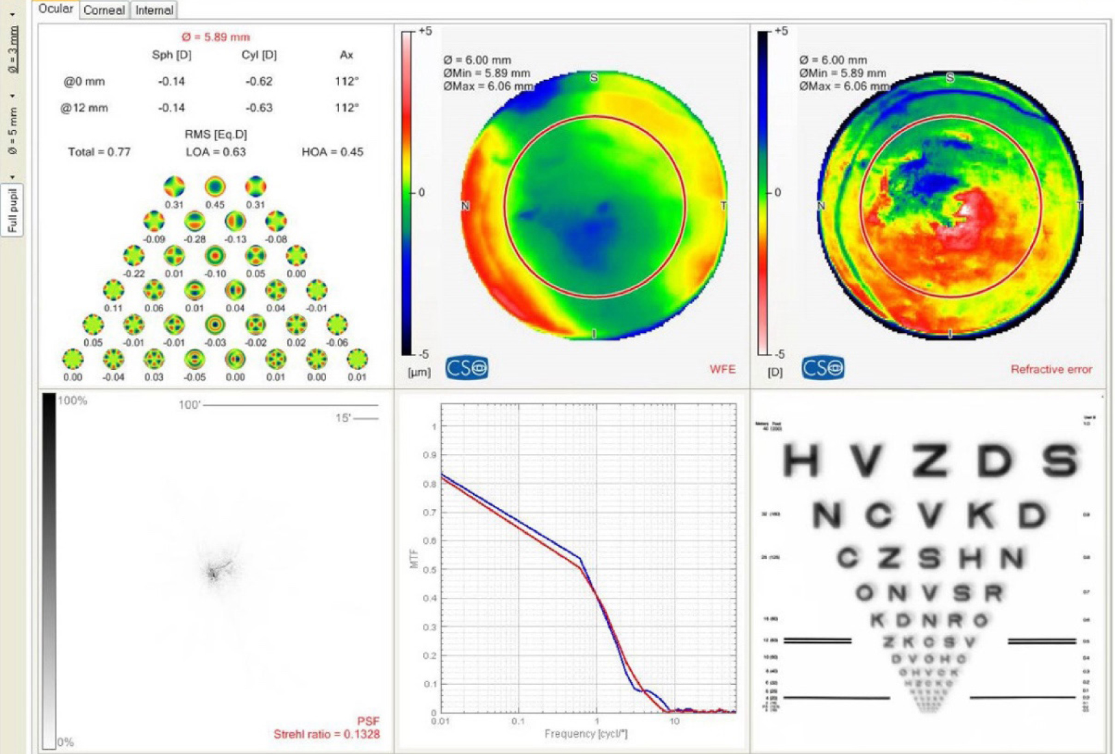 Всем больным было проведено всестороннее офтальмологическое исследование, включая аберрометрию волнового фронта с построением рефракционных топографических карт на приборе (Peramis, SCHWIND eye-tech-solutions GmbH, Германия) со встроенным пирамидальным сенсором и программным обеспечением Phoenix.
