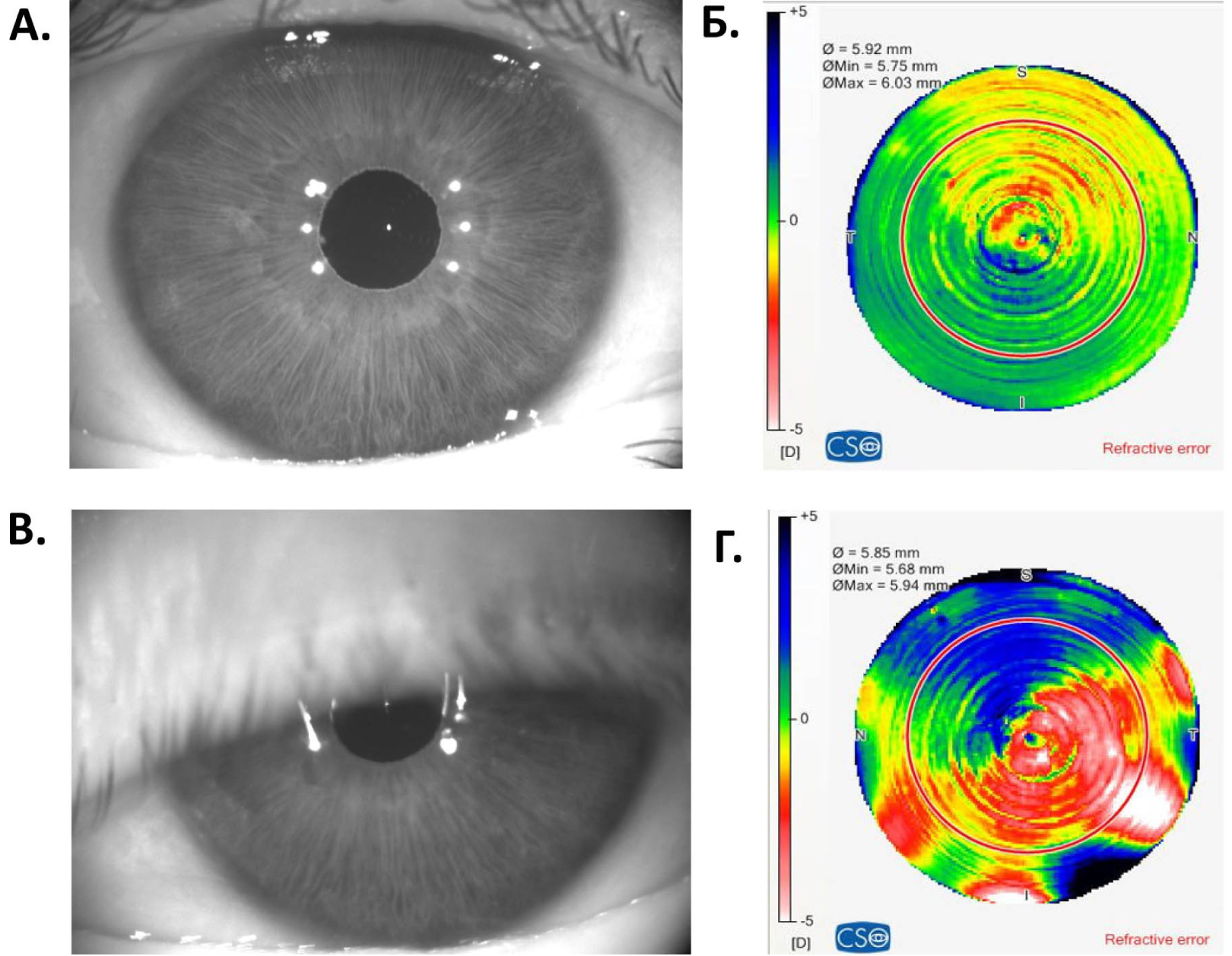 Рис. 2. Верификация рефракционной карты глаза по фронтальному Шеймпфлюг-изображению переднего отрезка глаза: А, Б – измерение сделано правильно; В, Г – измерение сделано некорректно из-за неполного открытия глазной щели