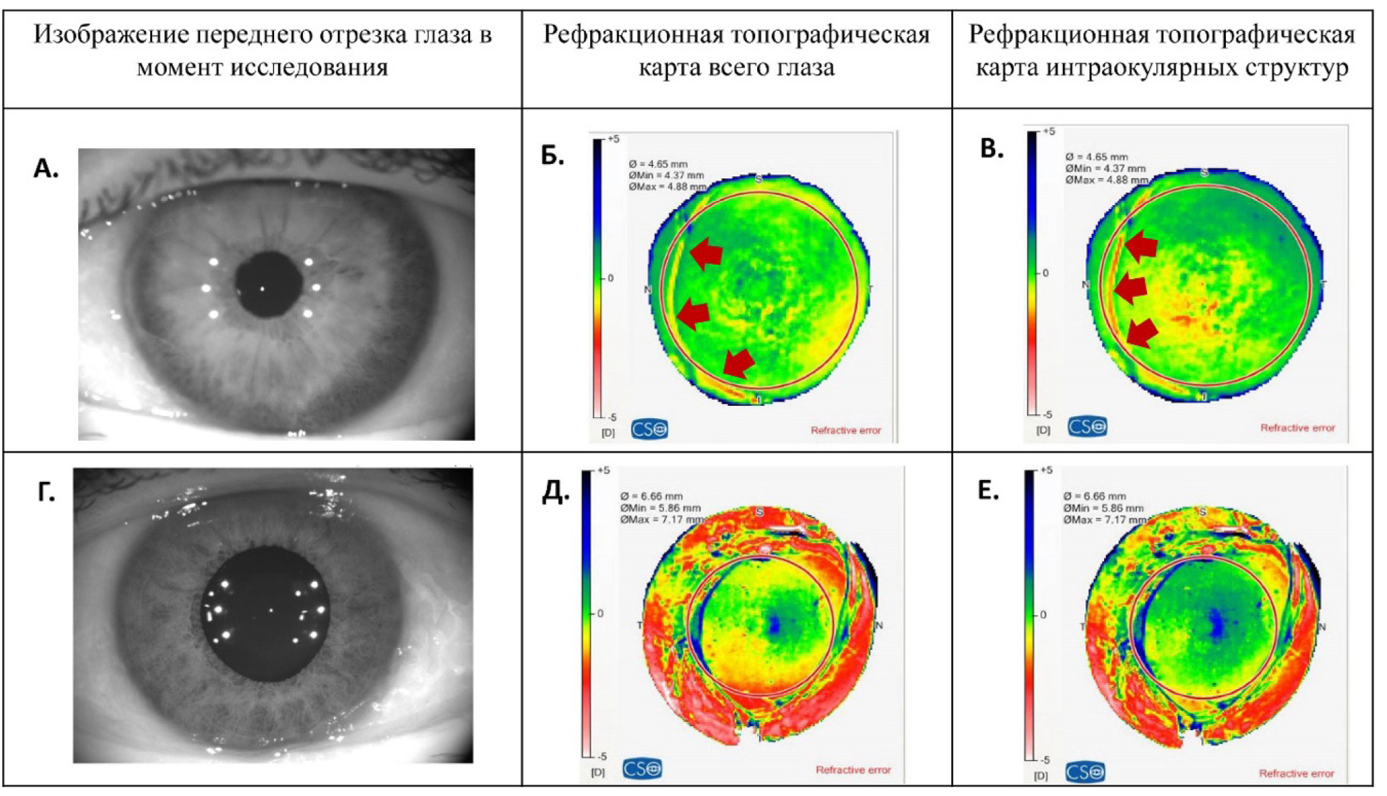 Рис. 3. Отображение фактического состояния зрачка и рефракционных карт: А, Б, В – клинический случай 1, исследование проведено в естественных условиях зрачка; Г, Д, Е – клинический случай 2, исследование выполнено в условиях медикаментозного мидриаза