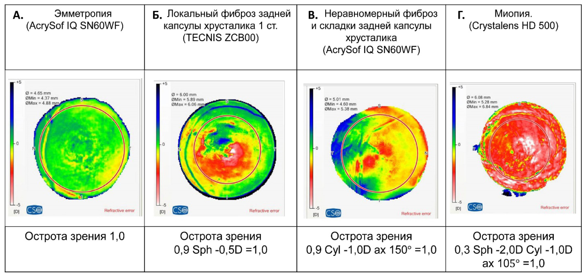 Построение рефракционных карт и цветное картирование выявило неравномерное распределение рефракционных значений по всей площади исследования и наличие разрозненных зон с отклонением в рефракции. Было установлено, что такие отдельные зоны с локальным отклонением в рефракции топически соответствовали зонам фиброза задней капсулы хрусталика. Так, на рис. 4 представлены карты глаз с эмметропией (А), с локальным фиброзом задней капсулы хрусталика 1-й степени (Б и В), с миопической рефракцией глаза вследствие поздно-приобретенного переднего реверса псевдоаккомодирующей ИОЛ Crystalens HD (Г).