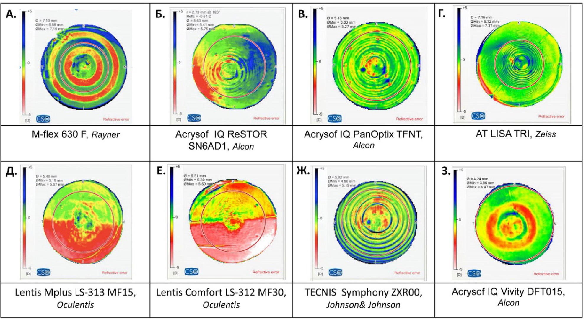 Визуализация расположения зон аддидации отражает центрирование линзы по отношению к зрительной оси. Рефракционные карты интраокулярных структур у пациентов с мультифокальными ИОЛ и ИОЛ с расширенным диапазоном фокуса представлены на рис. 5.
