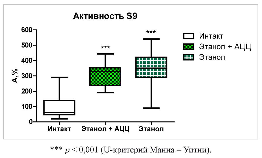Хроническая же алкоголизация приводила к изменению экспрессии и усилению активности оксидоредуктаз в печени. Активность S9 при использовании АЦЦ хоть и не отличалась от показателя у животных без лечения статистически значимо, была заметно ниже.