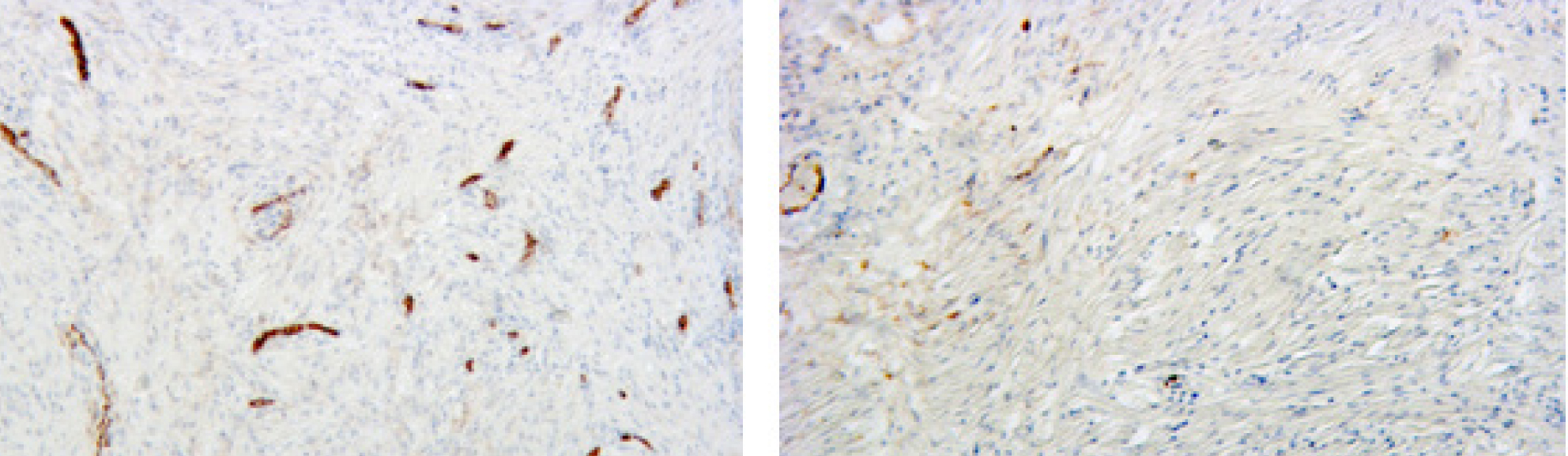 Рис. 7. Разреженная сосудистая сеть и бессосудистые участки в мышечно-фиброзном компоненте простаты. ИГХ исследование экспрессии маркеров CD34, докраска ядер гематоксилином Майера, × 100