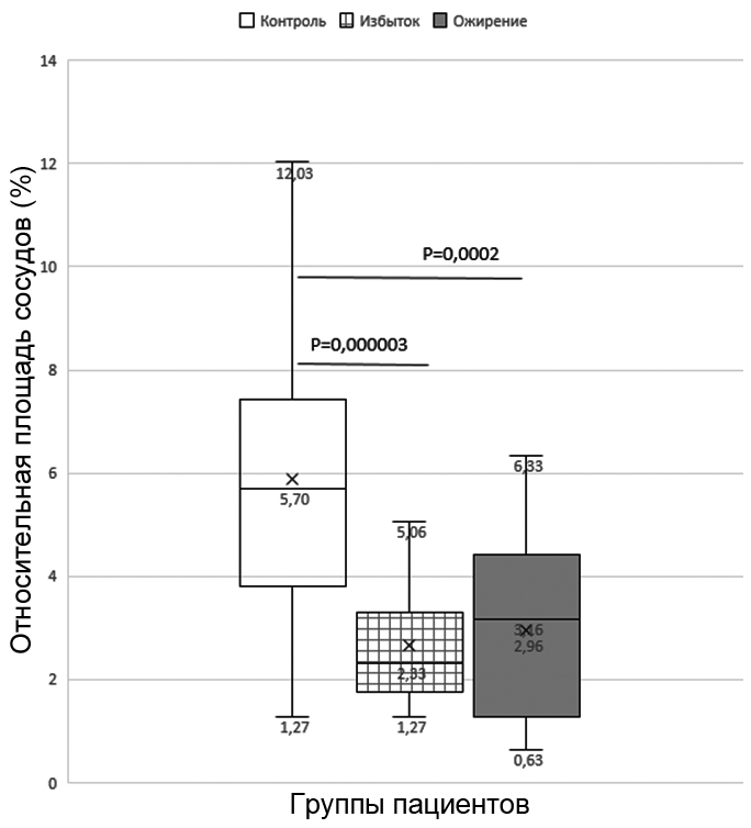 Рис. 8. Относительная площадь сосудов МЦР в мышечно-фиброзном компоненте предстательной железы в группах мужчин с разной массой тела