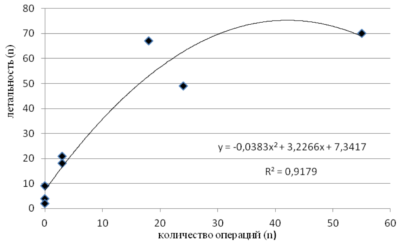 Results: An analysis of the functional relationships between the number of laparoscopic operations performed and mortality was carried out based on the results of primary statistical information (2 189 patients with a perforated ulcer). Strong direct correlations have been established, which can be most reliably described within the framework of polynomial regression models (r2 = 0.917 and r2 = 0.889).