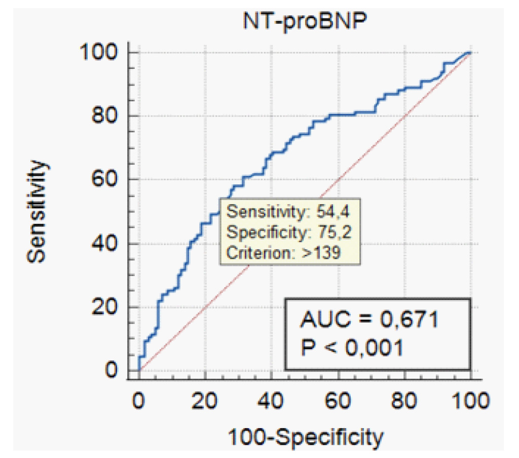 При построении ROC-кривой для всех значений NT-proBNP была получена точка отсечения >139 пг/мл (AUC = 0,671, p < 0,001) (рис. 6). Чувствительность и специфичность данного параметра составили 54,4 и 75,2 % соответственно.
