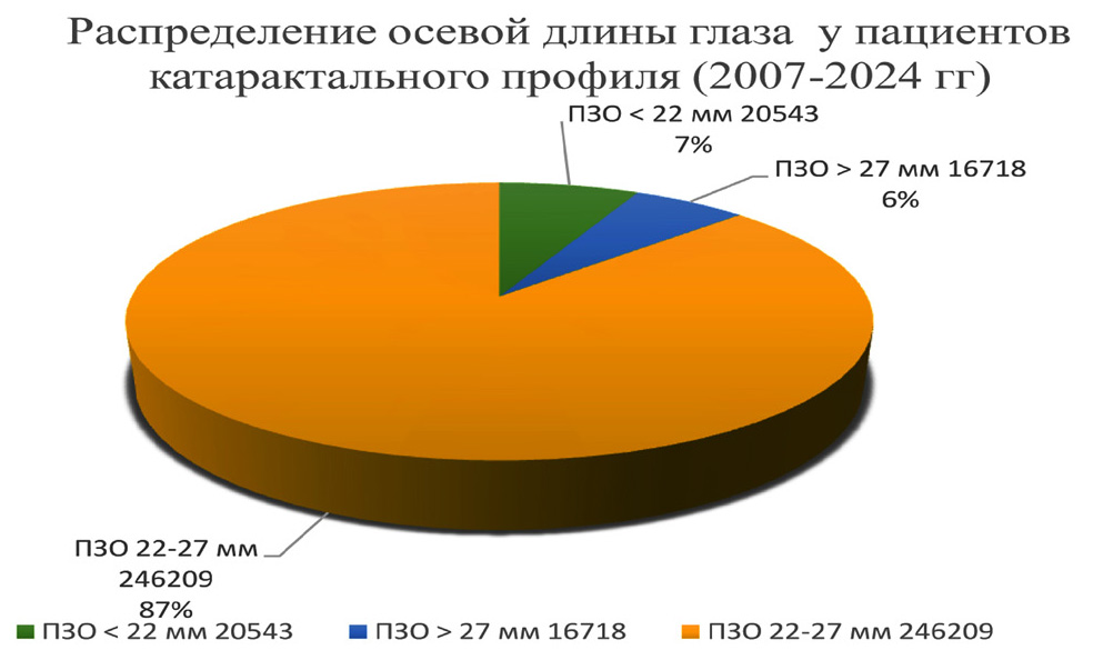 Данная работа представляет собой ретроспективный анализ и проспективное исследование, выполненные на базе ФГАУ «НМИЦ «МНТК «Микрохирургия глаза» им. акад. С.Н. Федорова за период с 2007 по 2024 год. В исследовании включено 37261 пациент с длиной глаза менее 22 мм и более 27 мм, которым была проведена факоэмульсификация катаракты с имплантацией интраокулярной линзы (ИОЛ), что составило 7 и 6 % соответственно от общего число прооперированных за данный период (рис. 1).