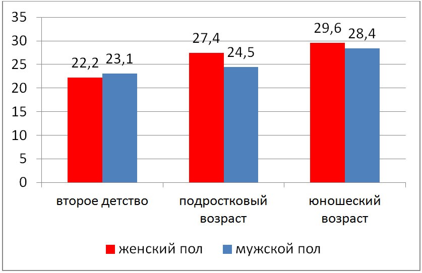 Доля учащихся с рефракционным астигматизмом, равным 0,75 дптр и более, у обследуемых периода второго детства составила 22,2 % среди девочек и 23,1 % среди мальчиков. К подростковому возрасту показатель рефракционного астигматизма увеличился, как среди лиц женского пола до 27,4 %, так и среди мужского пола до 24,5 % (р > 0,05). Показатель астигматизма был максимальный среди девушек – 29,5 % и юношей – 28,4 %, при этом выявлены статистически значимые отличия в сравнении с параметрами периода второго детства (р < 0,05, критерий Макнемана) (рис. 2).