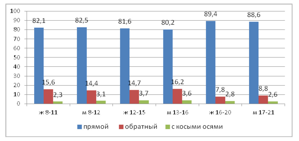 Определено процентное соотношение типов астигматизма в зависимости от пола и возраста. Отмечается преобладание прямого типа астигматизма по всех группах, на втором месте выявляли астигматизм обратного типа, наименьшее значение занимает астигматизм с косыми осями как у лиц женского, так и мужского пола во всех группах. В юношеском возрасте как у лиц женского, так и у лиц мужского пола, выявлено статистически значимое снижение доли астигматизма обратного типа и увеличение доли астигматизма прямого типа в сравнении с респондентами младших возрастов (р < 0,05, критерий Макнемара) (рис. 5).