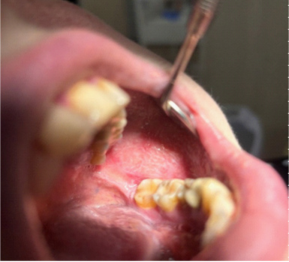 Рис. 7. Клинические проявление бисфосфонатного остеонекроза нижней челюсти слева