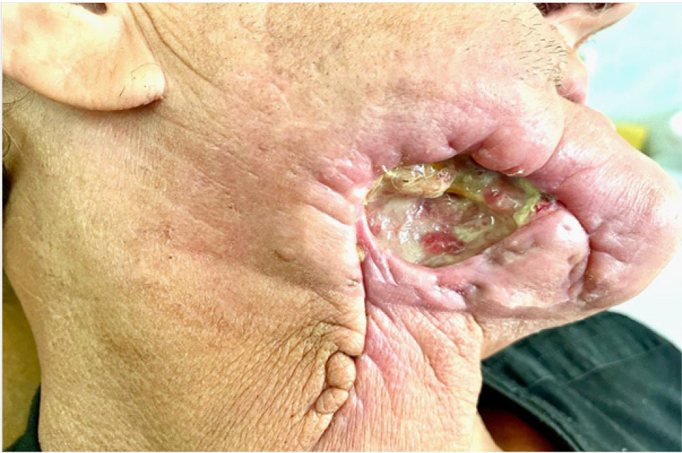 Из анамнеза жизни. Находится на диспансерном учете по поводу злокачественного образования челюстно-лицевой области. Неоднократно проводились курсы лучевой терапии, проведено хирургическое лечение.