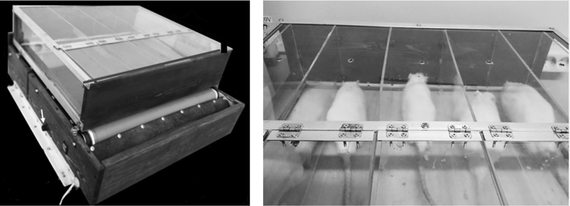 Рис. 1. Устройства для моделирования физической нагрузки в виде дозированного, принудительного бега. Стрелкой показан регулятор скорости беговой дорожки