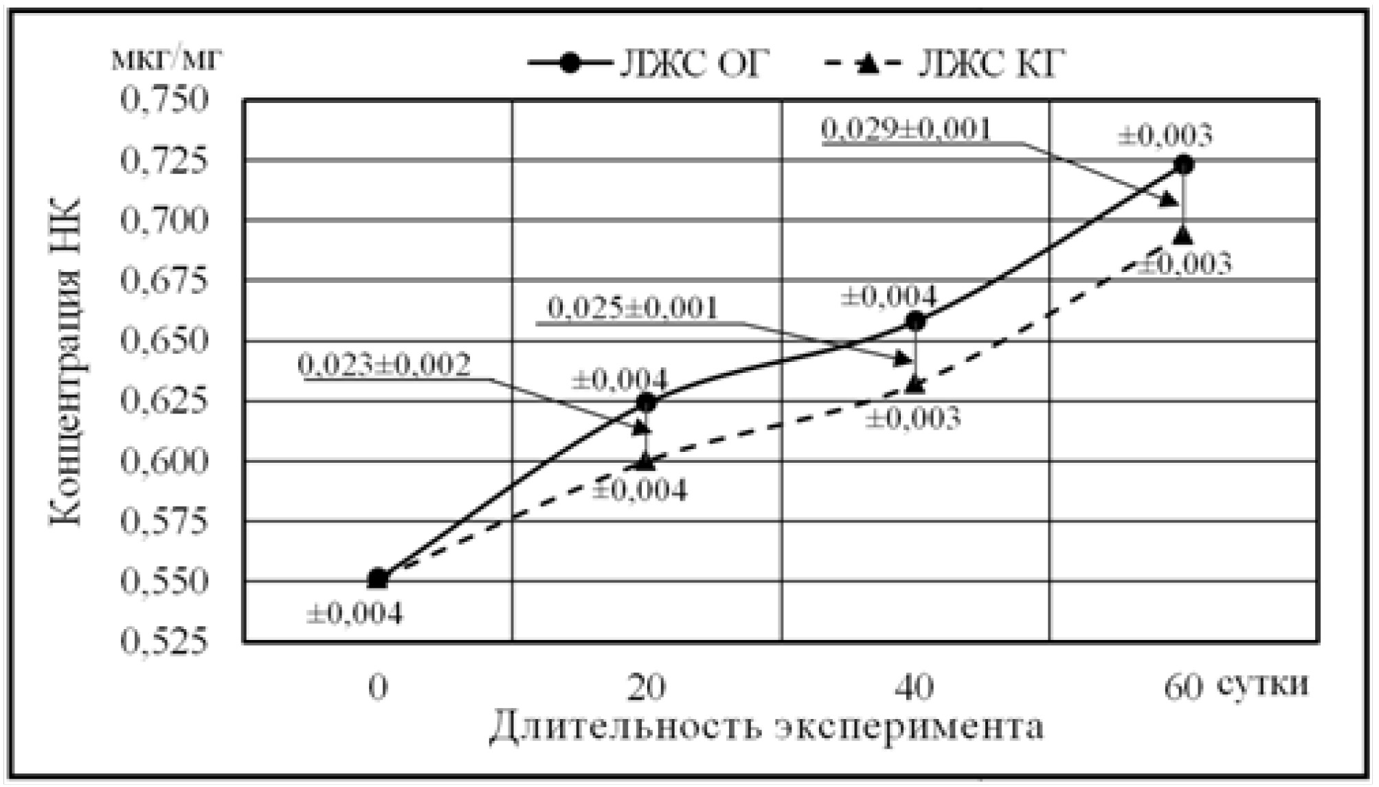 На 60-е сутки в миокарде ПЖС крыс КГ концентрация НК была (0,630 ± 0,005) мкг/мг, что больше в (1,102 ± 0,002) раза, на (0,058 ± 0,001) мкг/мг, 40-суточного показателя (rxy = 0,991; p = 0,001), и меньше в (1,101 ± 0,003) раза (rxy = 0,984; p < 0,001), чем в ЛЖС. В миокарде ЛЖС концентрация НК была (0,694 ± 0,003) мкг/мг, что больше в (1,097 ± 0,002) раза, на (0,061 ± 0,001) мкг/мг 40-суточного показателя (rxy = 0,949; p < 0,001).