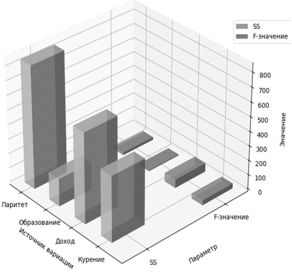 Сумма квадратов (SS) отражает совокупную вариацию изучаемого показателя и распределяет ее между отдельными источниками – такими как паритет, уровень образования, доход и курение. Степени свободы (df) определяются числом уровней каждого исследуемого фактора и обеспечивают корректность статистических расчетов. Средние квадраты (MS) вычисляются как частное от деления суммы квадратов на соответствующее число степеней свободы, тем самым отражая средний вклад каждого фактора в общую дисперсию данных. F-статистика представляет собой отношение средних квадратов между группами к средним квадратам внутри групп, выступая ключевым критерием для оценки различий между группами, p-значение позволяет судить о статистической значимости влияния того или иного фактора (табл. 5).