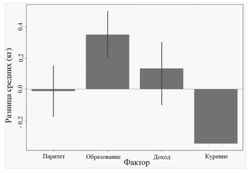 Результаты проведенного анализа выявили выраженное влияние всех рассмотренных факторов на массу новорожденного. Наиболее значимым оказался паритет (F = 71,77, p < 0,001), за ним следовали уровень дохода (F = 78,90, p < 0,001), курение матери (F = 114,62, p < 0,001) и образование (F = 24,18, p = 0,002).