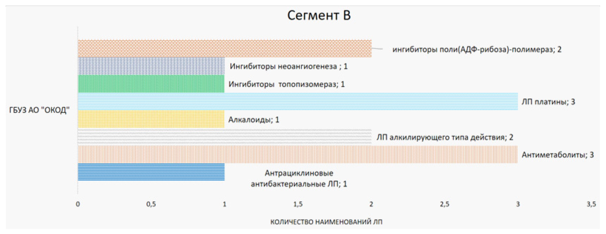 К сегменту B, занимающему 10–20 % наименований и около 15 % бюджета во всех МО, были отнесены были ЛС 1–2-й линий химиотерапии, ЛП купирования нежелательных реакций и отдельными группами инновационные ЛС: противоопухолевые антибактериальные препараты группы антрациклинов, представленные в ГБУЗ АО «ОКОД» – 1 наименованием, ГБУЗ КОД № 1 – 9, ГБУЗ ВО «ВОКОД» – 2, ФГБУ «НМИЦ ОНКОЛОГИИ» – 3; ЛС алкилирующего типа действия: в ГБУЗ АО «ОКОД» – 2, МНИОИ им. П.А. Герцена – 6, ГБУЗ КОД № 1 – 4, ГБУЗ ВО «ВОКОД» – 7, ФГБУ «НМИЦ ОНКОЛОГИИ» – 5; эстрогенов синтеза ингибиторы: МНИОИ им. П.А. Герцена – 2, ФГБУ «НМИЦ ОНКОЛОГИИ» – 1; алкалоиды: ГБУЗ АО «ОКОД» – 1, МНИОИ им. П.А. Герцена – 2, ГБУЗ КОД № 1 – 9, ГБУЗ ВО «ВОКОД» – 3, ФГБУ «НМИЦ ОНКОЛОГИИ» – 3; антиметаболиты: ГБУЗ АО «ОКОД» – 3, МНИОИ им. П.А. Герцена – 6, ГБУЗ КОД № 1 – 9, ГБУЗ ВО «ВОКОД» – 8, ФГБУ «НМИЦ ОНКОЛОГИИ» – 7; ЛП платины: ГБУЗ АО «ОКОД» – 3, МНИОИ им. П.А. Герцена – 9, ГБУЗ ВО «ВОКОД» – 3, ФГБУ «НМИЦ ОНКОЛОГИИ» – 3; ингибиторы неоангиогенеза: ГБУЗ АО «ОКОД» – 1, ГБУЗ КОД № 1 – 1, ФГБУ «НМИЦ ОНКОЛОГИИ» – 1; ингибиторы топопизомераз: ГБУЗ АО «ОКОД» – 1, МНИОИ им. П.А. Герцена – 1, ГБУЗ КОД № 1 – 1, ГБУЗ ВО «ВОКОД» – 1, ФГБУ «НМИЦ ОНКОЛОГИИ» – 1; ингибиторы поли(АДФ-рибоза)-полимераз: ГБУЗ АО «ОКОД» – 2; ингибиторы антиапоптозного белка В-клеточной лимфомы (BCL-2): ГБУЗ КОД № 1 – 1, ГБУЗ ВО «ВОКОД» – 1, ФГБУ «НМИЦ ОНКОЛОГИИ» – 1; таксаны: МНИОИ им. П.А. Герцена – 3, ГБУЗ ВО «ВОКОД» – 4, ФГБУ «НМИЦ ОНКОЛОГИИ» – 2; ингибиторы костной резорбции при метастазах в кости: МНИОИ им. П.А. Герцена – 1, ГБУЗ КОД № 1 – 1, ГБУЗ ВО «ВОКОД» – 1, ФГБУ «НМИЦ ОНКОЛОГИИ» – 1; иммунодепрессанты: МНИОИ им. П.А. Герцена – 1, ГБУЗ КОД № 1 – 2, ГБУЗ ВО «ВОКОД» – 3, ФГБУ «НМИЦ ОНКОЛОГИИ» – 1; иммуноглобулины: МНИОИ им. П.А. Герцена – 1, ГБУЗ КОД № 1 – 2; радиофармацевтические терапевтические средства: ФГБУ «НМИЦ ОНКОЛОГИИ» – 1; высокоселективные обратимые ингибиторы активности протеасомы 26S: МНИОИ им. П.А. Герцена – 2; ингибиторы ароматазы: МНИОИ им. П.А. Герцена – 1; аналоги гонадотропин-рилизинг гормона: МНИОИ им. П.А. Герцена – 1; противоопухолевые гормональные средства и антагонисты гормонов: МНИОИ им. П.А. Герцена – 1. Среди терапии купирования нежелательных реакций были выделены следующие фармако-терапевтические группы: антибактериальные ЛП: ГБУЗ КОД № 1 – 14, ФГБУ «НМИЦ ОНКОЛОГИИ» – 22; противорвотные средства: ГБУЗ КОД № 1 – 4, МНИОИ им. П.А. Герцена – 5; рентгеноконтрастные средства: ГБУЗ КОД № 1 – 4, ФГБУ «НМИЦ ОНКОЛОГИИ» – 5; стимуляторы лейкопоэза: ГБУЗ КОД № 1 – 2, ГБУЗ «ВОКОД» – 1, ФГБУ «НМИЦ ОНКОЛОГИИ» – 2, МНИОИ им. П.А. Герцена – 2; антикоагулянты: ФГБУ «НМИЦ ОНКОЛОГИИ» – 3; ингибиторы протонного насоса: ФГБУ «НМИЦ ОНКОЛОГИИ» – 3, МНИОИ им. П.А. Герцена – 3; фотосенсибилизирующие средства: МНИОИ им. П.А. Герцена – 2; ФГБУ «НМИЦ ОНКОЛОГИИ» – 2; стимуляторы гемопоэза: МНИОИ им. П.А. Герцена – 2, ФГБУ «НМИЦ ОНКОЛОГИИ» – 3; гепатопротекторные средства: ФГБУ «НМИЦ ОНКОЛОГИИ» – 2, МНИОИ им. П.А. Герцена – 1; представленные в МНИОИ им. П.А. Герцена: противовирусные препараты – 4; противогрибковые ЛП системного действия – 5; метаболические средства – 4; синтетические аналоги соматостатина – 1; нестероидные противовоспалительные средства (НПВС) – 6; седативные препараты для внутривенной анестезии – 2; гипоазотемические средства – 1; плазмозамещающие растворы – 3; антидоты: МНИОИ им. П.А. Герцена