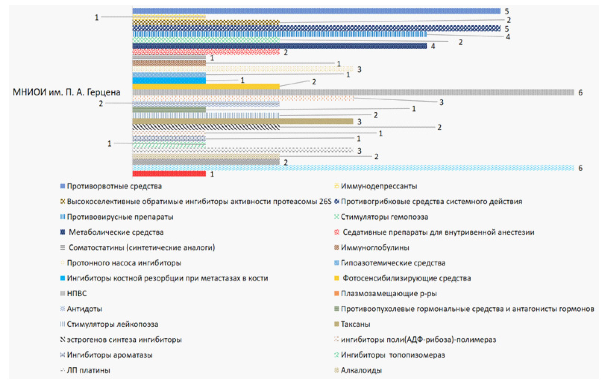 Рис. 4. Фармакотерапевтические группы ЛС, относящиеся к A сегменту в МНИОИ им. П.А. Герцена