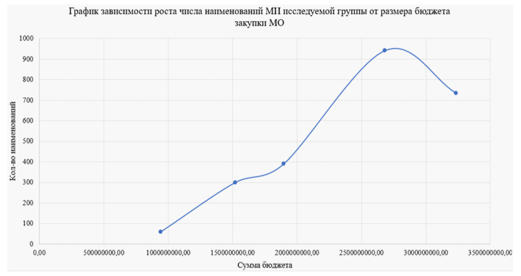 Рис. 16. График зависимости роста числа наименований МИ исследуемой группы от размера бюджета закупки ЛП и МИ МО