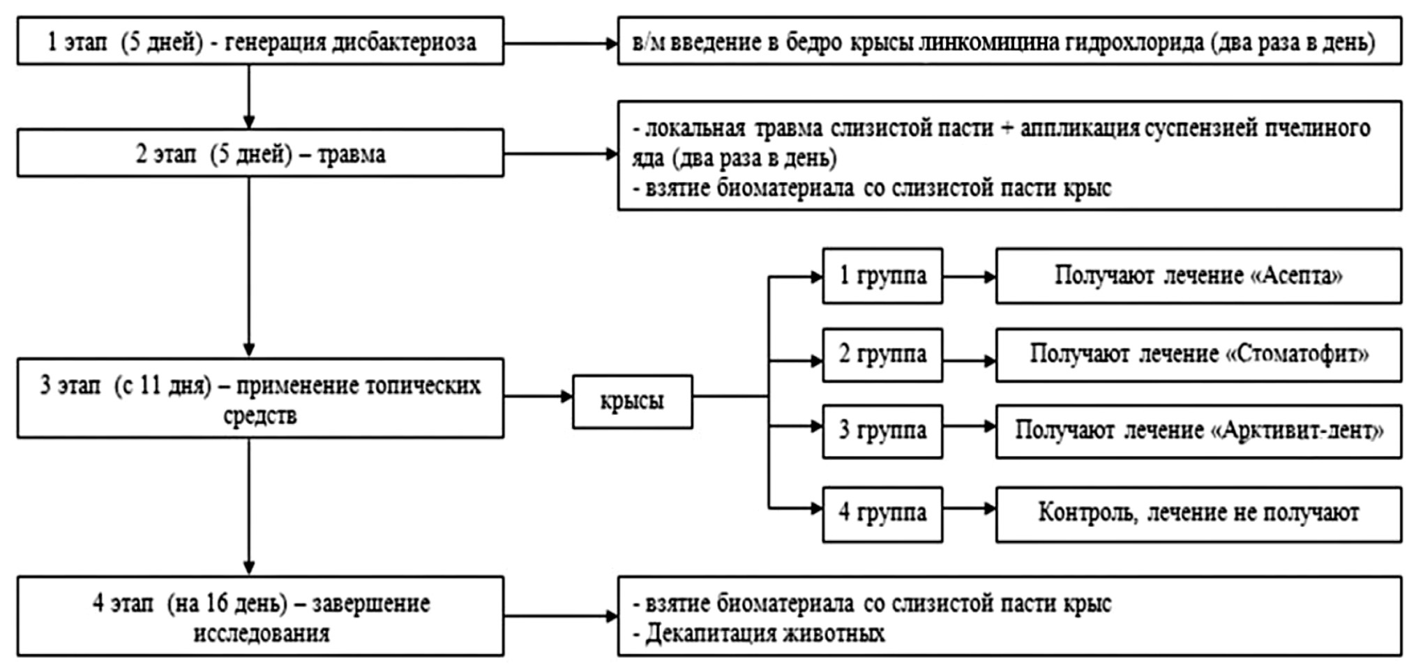 Первый этап (5 дней) – генерация дисбактериоза ротовой полости животных путем внутримышечного введения в бедро крысы линкомицина гидрохлорида (30 мг на 100 г веса два раза в день). Второй этап (5 дней) – локальное механическое повреждение тканей пародонта и слизистой пасти между губой и зубами в области резцов нижней челюсти и аппликация суспензией пчелиного яда (2 мг на 100 г веса два раза в день). Применение местных препаратов начиналось в день завершения моделирования гингивита (10-й день). Начиная с 10-го дня опыта, крысам 1, 2, 3-й групп осуществляли аппликации препаратами местного действия «Стоматофит», «Арктивит-дент», «Асепта» соответственно. Топические средства наносили на стерильные ватные тампоны и осуществляли аппликации 2 раза в день, утром и вечером, среднее время аппликации составляло 10–12 минут. Контрольной (4-й) группе животных лечебные манипуляции не проводились. После завершения исследования, на 16-й день, проводилось выведение животных из эксперимента методом декапитации. Декапитация животных осуществлялась в условиях передозировки эфира.