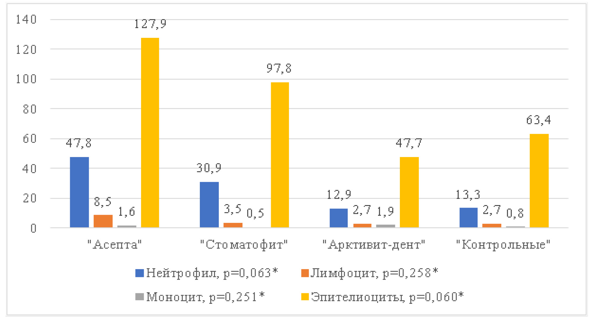 Статистический анализ среднего количества нейтрофилов в буккальном эпителии на 10-е сут. моделирования экспериментального гингивита показал отсутствие значимых отличий (р = 0,063) между группами («Асепта» – 47,8; «Стоматофит» – 30,9; «Арктивит-дент» – 12,9 и «Контрольные» – 13,3). Среднее значение количества лимфоцитов также значимо не отличалось (р = 0,258) между группами («Асепта» – 8,5; «Стоматофит» – 3,5; «Арктивит-дент» – 2,7 и «Контрольные» – 2,7). При определении среднего значения моноцитов между группами («Асепта» – 1,6; «Стоматофит» – 0,5; «Арктивит-дент» – 1,9 и «Контрольные» – 0,8) не выявлено статистически значимых отличий (р = 0,251). Несмотря на отсутствие статистических значимых отличий (р = 0,06) показателей эпителиоцитов в буккальном эпителии («Асепта» – 127,9; «Стоматофит» – 97,8; «Арктивитдент» – 47,7 и «Контрольные» – 63,4), абсолютные значения выявлены выше в группе «Арктивит-дент» (рис. 3).
