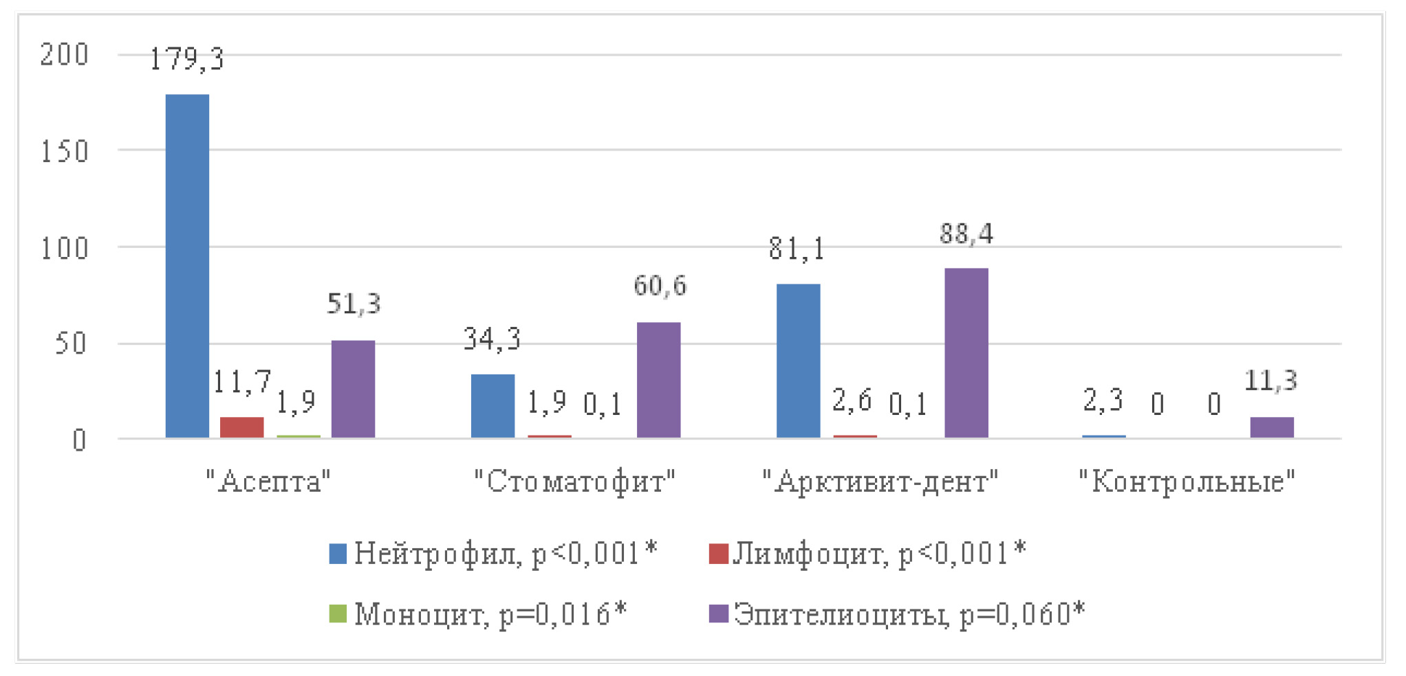 На 16-й день эксперимента проведен повторный анализ буккального эпителия во всех группах исследования, в результате которого наименьшие средние значения всех клеточных элементов выявлено в группе «Контрольные» (нейтрофилы – 2,3, лимфоциты – 0, моноциты – 0, эпителиоциты – 11,3). В то же время самое высокое среднее количество нейтрофилов – 179,3, лимфоцитов – 11,7, моноцитов – 1,9 выявлено в группе «Асепта». Уровни критической значимости указаны на рис. 4. Стоит отметить, что среднее значение количества эпителиоцитов статистически не отличалось во всех группах исследования (р = 0,060).