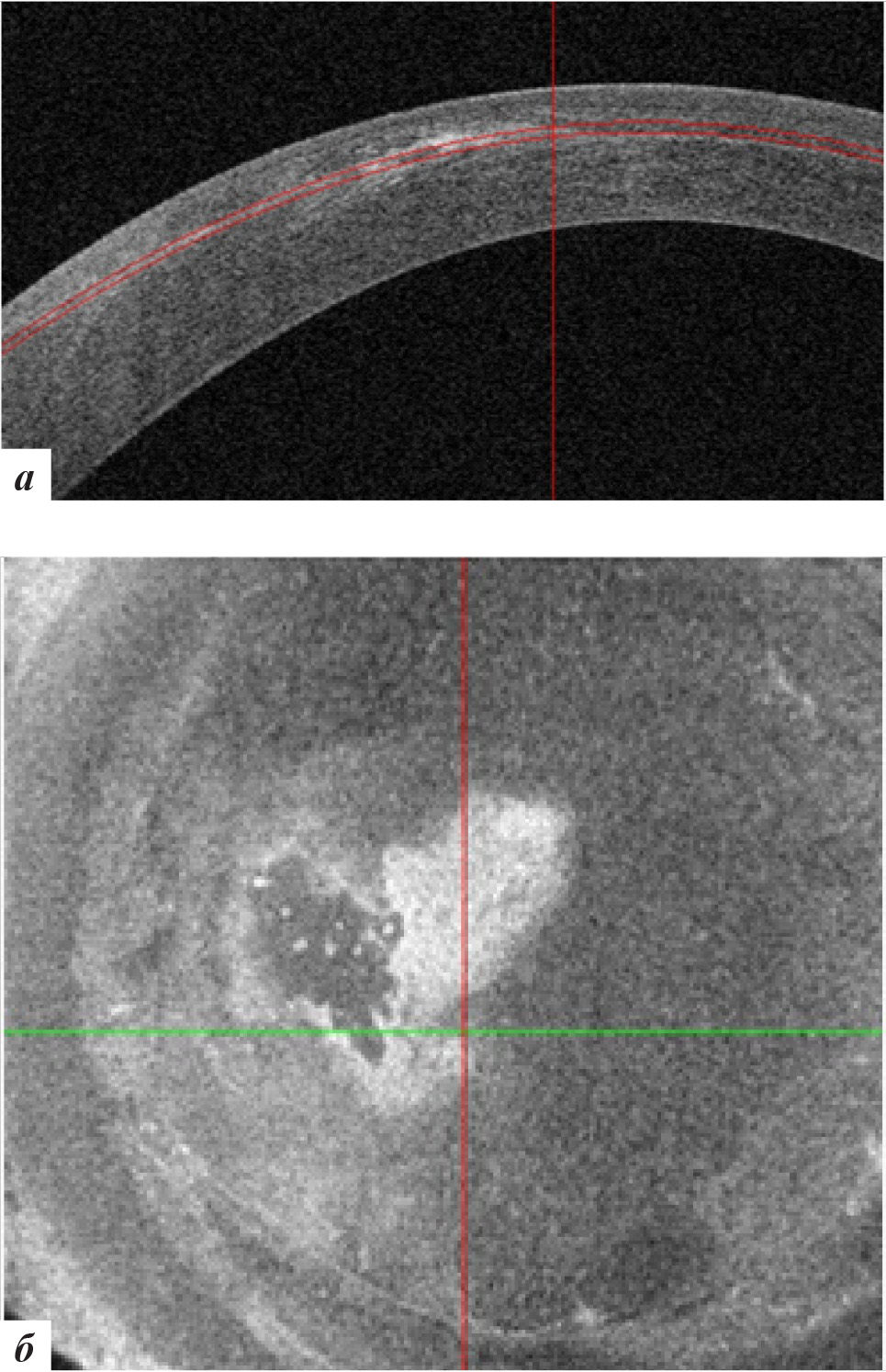 Рис. 7. Данные ОКТ роговицы левого глаза через 3 месяца после лечения: а – горизонтальная проекция, б – фронтальная проекция