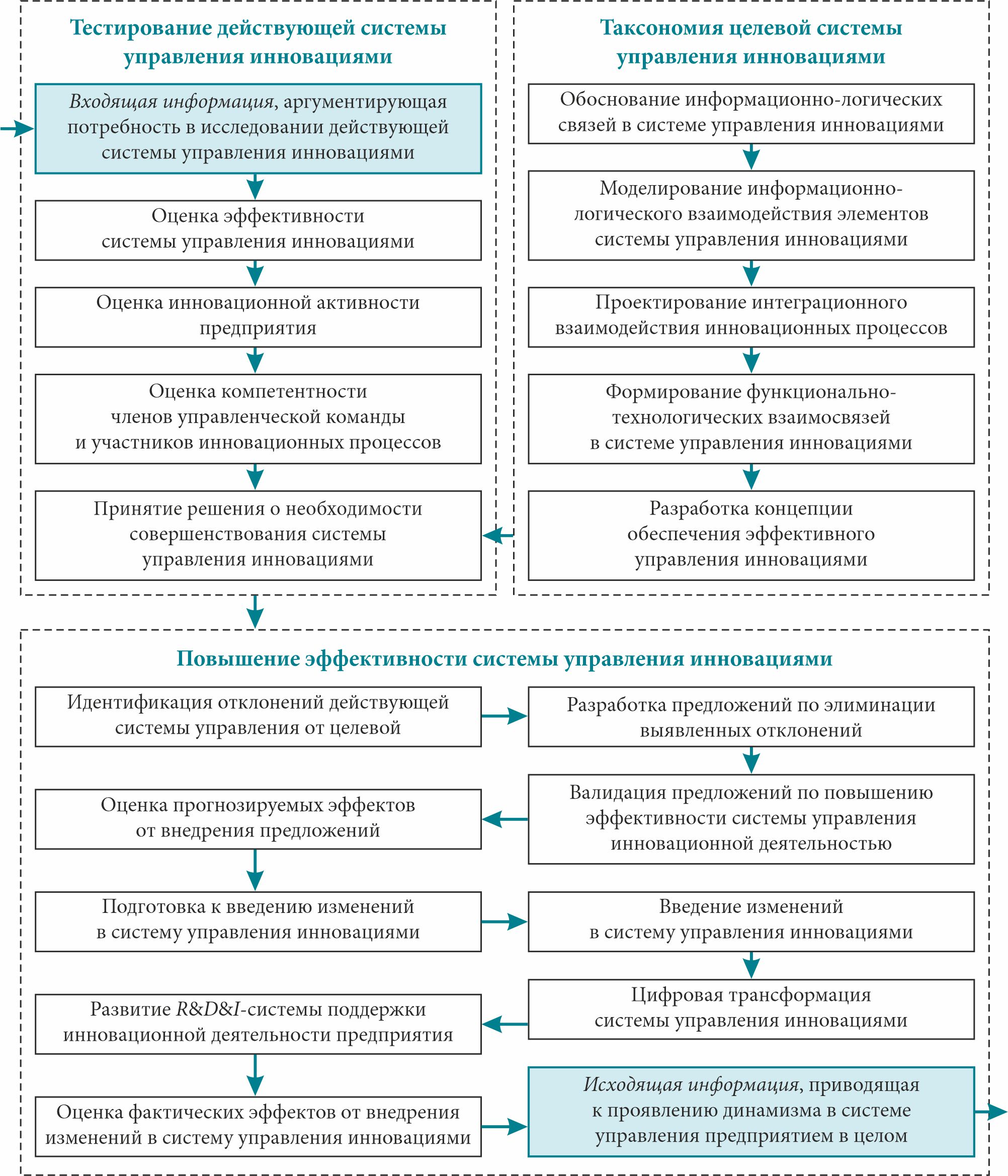 Вопросы обеспечения согласованности элементов системы управления инновациями с элементами смежных систем управления имеют первостепенную значимость при осуществлении модификационных перемен. Их решению посвящены труды многих современных исследователей, например [7; 8; 24], однако в них в полной мере не отражены потребности отечественного менеджмента в связи с отсутствием детализации информационно-инновационных потоков, параметров, ресурсов, технологий управления и прочей специфики субъект-объектных отношений, остро необходимых при осуществлении реформ в организационно-управленческой системе предприятия.