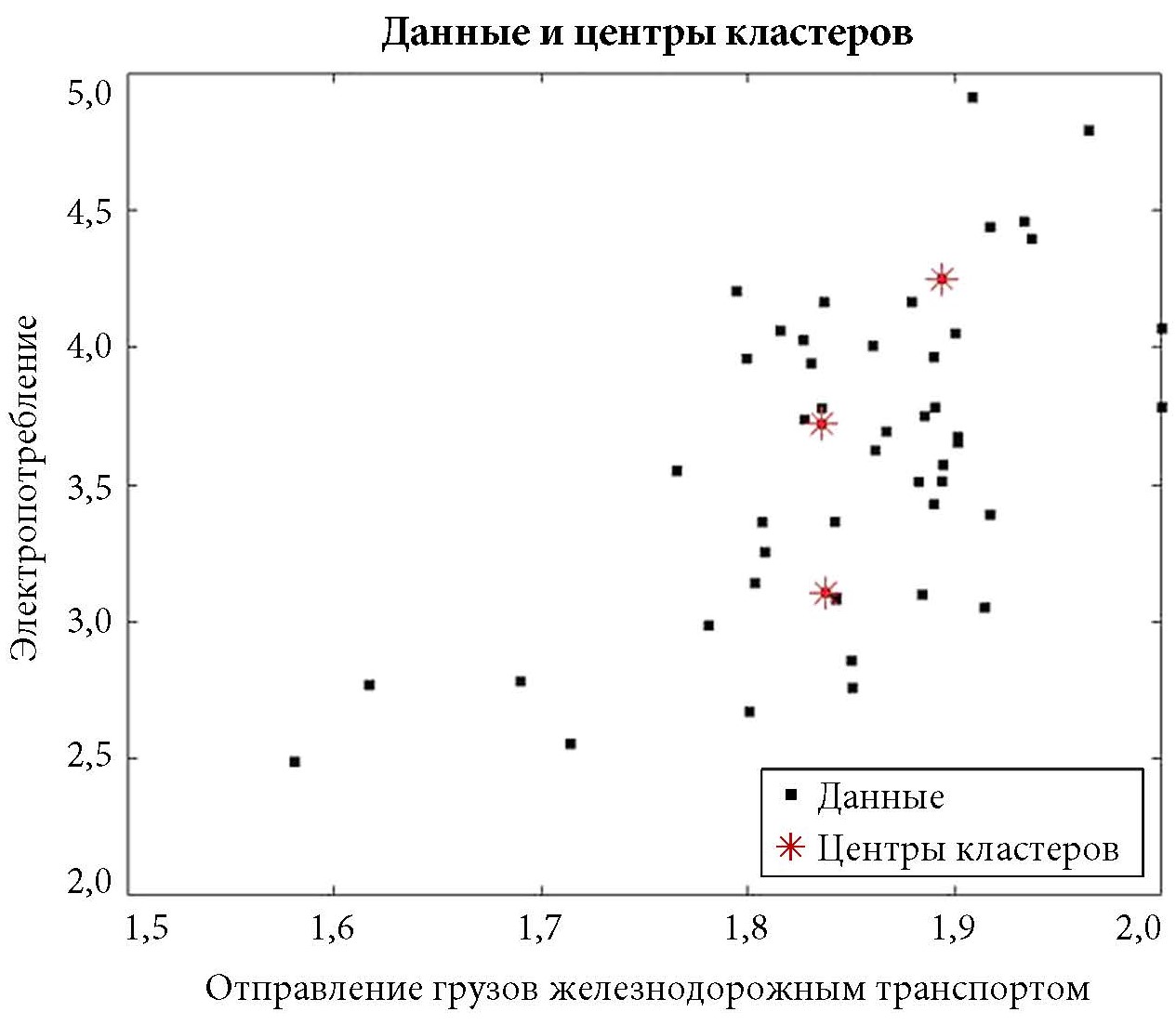 При проектировании нечеткой системы Сугено вся выборка эмпирических данных делится на обучающую (48 наблюдений) и тестовую (29 наблюдений), как и при реализации алгоритма случайного леса. Далее происходит синтез нечетких правил из обучающей выборки посредством субтрактивной кластеризации, представляющей собой быстрый однопроходный алгоритм оценки количества кластеров и центров кластеров в наборе данных. Субтрактивная кластеризация рассматривает каждую точку данных как потенциальный центр кластера, определяя потенциал точки данных как функцию ее расстояний до всех других точек данных [23]. Точка данных имеет высокое потенциальное значение, если у нее много соседей. Самый высокий потенциал выбирается в качестве центра кластера, а затем потенциал каждой точки данных обновляется. Процесс определения новых кластеров и обновления потенциалов повторяется до тех пор, пока оставшийся потенциал всех точек данных не упадет ниже некоторой доли потенциала первого центра кластера. После получения всех центров кластеров в результате субтрактивной кластеризации центры кластеров оптимизируются с помощью нечетких средств. При реализации этой кластеризации необходимо задать радиусы кластеров из диапазона [0, 1], определяющие, на каком максимальном расстоянии могут находиться его элементы. Для проектирования нечеткой системы Сугено с тремя нечеткими правилами выбран размер кластера, равный 0,7. Пример результата субтрактивной кластеризации для зависимости электропотребления от отправления грузов железнодорожным транспортом на обучающей выборке данных приведен на рис. 1.