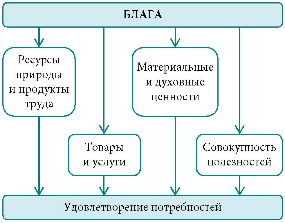 Как можно заметить, содержание выделенных подходов не является синонимичным: природные ресурсы, продукты труда, ценности и полезности имеют свою природу и экономическую сущность. При этом все определения сводятся к тому, что блага, какими бы они ни были, направлены на удовлетворение потребностей человека или общества в целом. Здесь важно отметить, что в своем историческом развитии человек совершенствовал имеющиеся способности и развивал новые, что отразилось на эволюции общественных интересов и потребностей, а следовательно, и на теоретических представлениях о благе. Таким образом, сегодня благом можно назвать все, что удовлетворяет потребности людей. В связи с этим в экономических исследованиях приводятся разные основания для классификации благ.