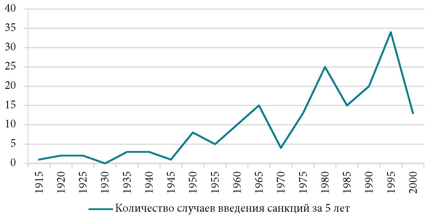 Санкции имеют давнюю историю. Более активно санкционная политика стала применяться после Второй мировой войны в связи с началом «холодной войны» между Западом и СССР. Парадоксально, но после окончания этой войны санкционная активность усилилась, и 90-е гг. ХХ в. были названы «санкционным десятилетием» [1]. Если в середине XX в. санкции применялись лишь к нескольким государствам, то к 2000 г. их объектами стали уже 50 государств. Начало нового тысячелетия привело к еще большему всплеску этой активности. Количество экономических санкций, введенных в 2010–2019 гг., почти в два раза выше их количества в 1990–2000 гг. [2]. Только в 2022 г. введено 62 санкции – столько же, сколько с 1949 по 1960 г. Главное же состоит в том, что наблюдается восходящий тренд в их использовании (рисунок). Все это говорит о том, что санкции стали популярным инструментом внешней политики. Причем современные санкции принимают такой размах, что их применение оказывает влияние на функционирование не только подсанкционных, но и других стран, а иногда и на всю мировую экономику.