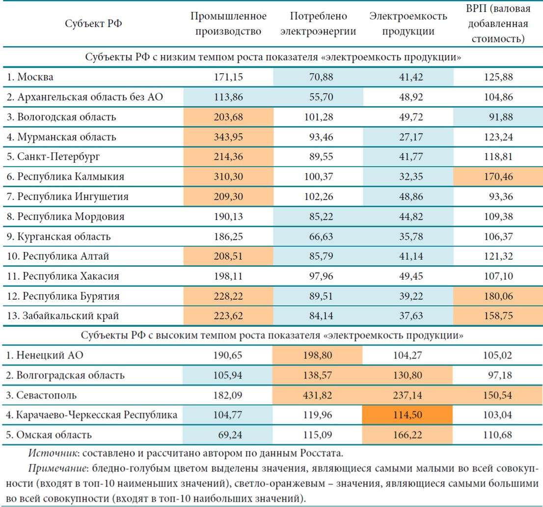Значения низкого и высокого темпов роста по показателю электроемкости представлены посубъектно в табл. 2.