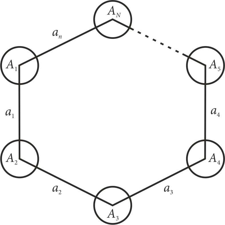 Для наглядности представим символическую схему предложенной модели N-компонентной системы хозяйственной деятельности региона. Здесь a1,a2,…,an – интенсивность потоков вещества, энергии и информации между компонентами системы, обозначенными A1,A2,…,AN соответственно. Схема модели представлена на рисунке.