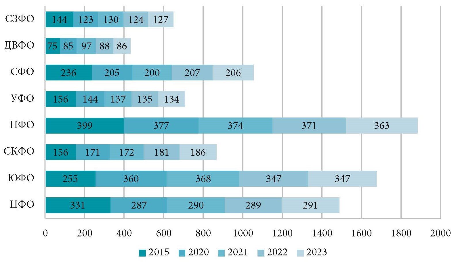 В сложных условиях рыночные процессы приводят к сокращению предложения лечебно-оздоровительных услуг и снижению количества СКО в регионах и федеральных округах (рис. 4). В Российской Федерации сложился устойчивый тренд на сокращение количества санаторно-курортных организаций. На уровне федеральных округов процесс рыночной оптимизации происходит по-разному. Так, в федеральных округах со сложными климатическими условиями рынок лечебно-оздоровительных услуг сформировался, количество СКО остается стабильным в последние годы. В Центральном и Северо-Кавказском округах в 2022–2023 гг. продолжается медленный рост числа здравниц, вызванный совокупностью благоприятных факторов. Южный федеральный округ показал снижение предложения, которое было избыточным.