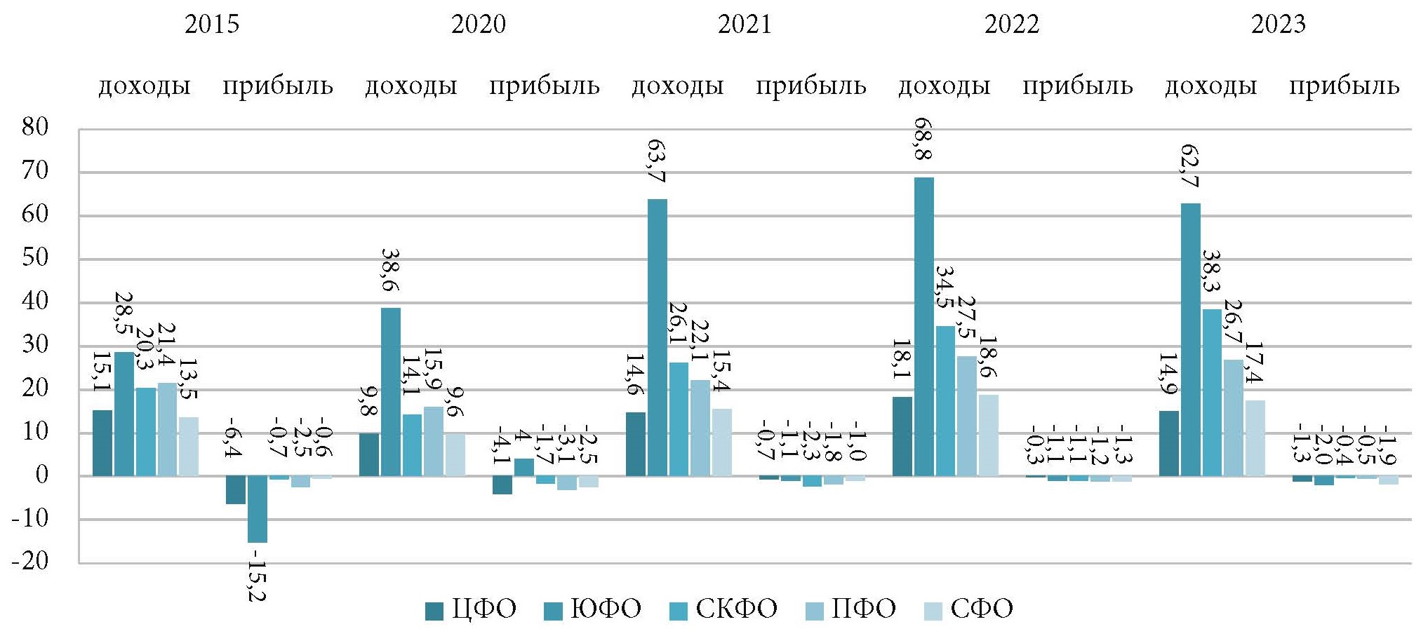 Представим показатели доходов и прибыли СКО по федеральным округам (рис. 5).