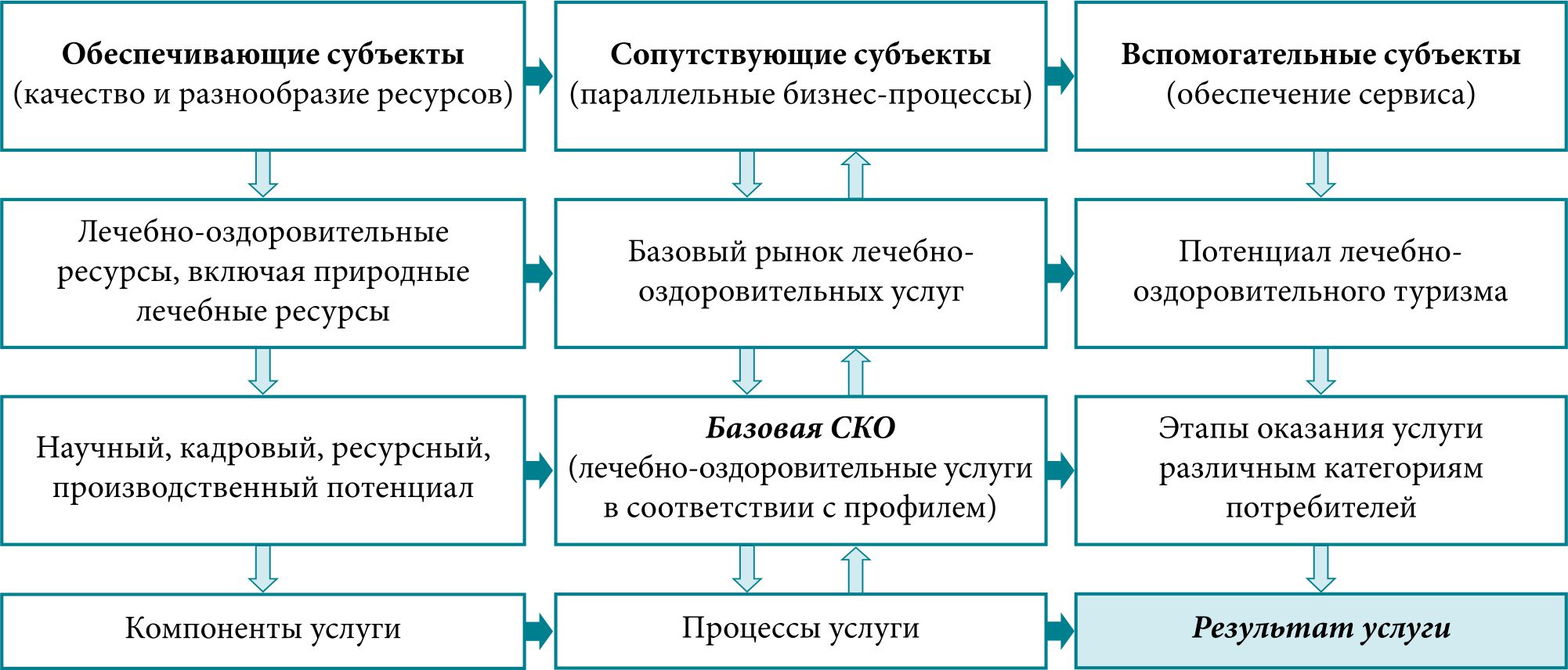Разработанная модель учитывает специализацию санаторно-курортных организаций и связанных субъектов бизнеса, направлена на интеграцию их ресурсного потенциала и компетенций в целях создания регионального предложения, обладающего высокими конкурентными характеристиками на российском рынке лечебно-оздоровительных услуг. Обеспечивающие субъекты формируют необходимые элементы услуги: диагностику, лечение, оздоровление, питание, размещение и т. д. – на основе природных лечебных ресурсов, имеющихся в регионе или определенной местности (курорте).