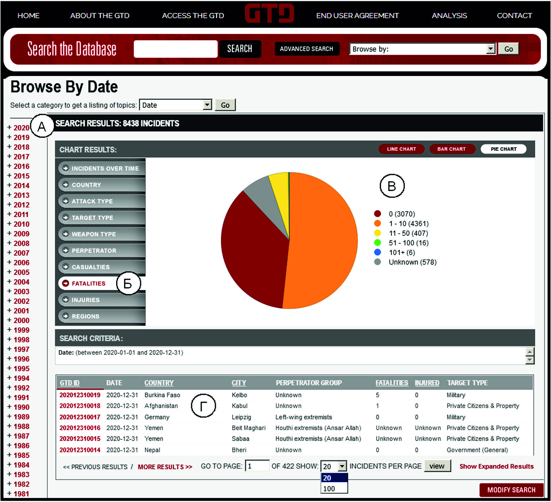 На рис. 2 изображена заставка сайта GTD [https://www.start.umd.edu/gtd/]. В поисковом режиме «Browse by» из всплывающего окна выбирали необходимую опцию, например год. После ее активации открывалось окно перечня временных параметров с 1970 по 2020 г. (рис. 3А), некоторых параметров ТА (см. рис. 3Б) и их визуализация (см. рис. 3В).