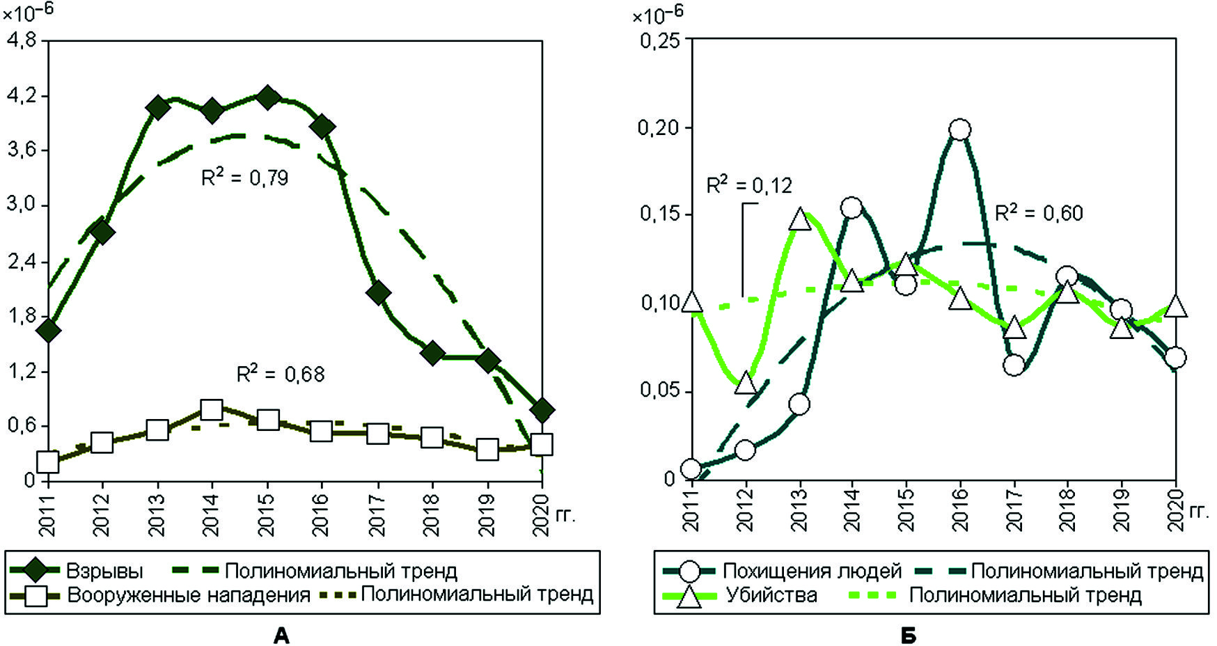 Среднегодовой показатель террористических актов с 2011 по 2020 г. в мире был 110 тыс. или 10,7 [8, 5; 14, 1] тыс., погибших людей – 25,8 тыс. или 23,1 [20, 4; 35, 3] тыс. человек, пораженных – 28,4 тыс. или 25,5 [18, 8; 40, 6] тыс. человек. Полиномиальные тренды указанных показателей напоминают инвертированные U-кривые с уменьшением данных в последний период наблюдения.