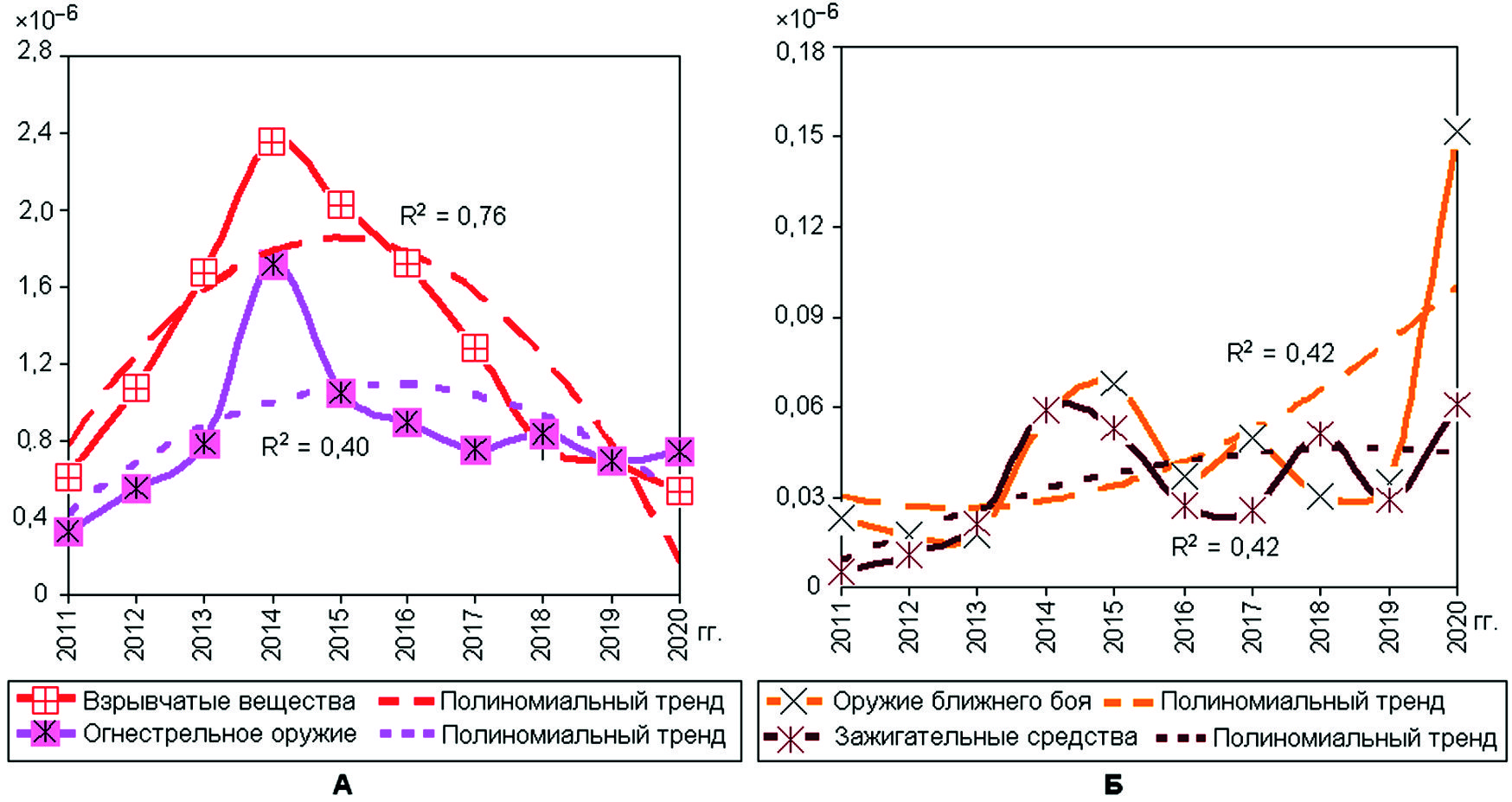 Полиномиальные тренды динамики индивидуальных рисков погибнуть в ТА с применением взрывчатых веществ и огнестрельного оружия при разных по значимости коэффициентах детерминации показывают инвертированные U-кривые с уменьшением данных в последний период наблюдения (рис. 16А). Полиномиальные тренды индивидуальных рисков гибели людей в ТА с оружием ближнего боля и зажигательными веществами при низком коэффициенте детерминации (R2 = 0,42) демонстрируют тенденцию роста показателей (см. рис. 16Б).