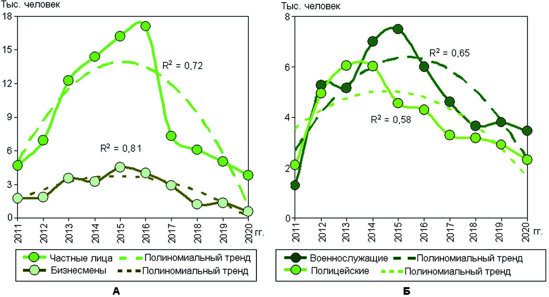 Динамика получивших травмы в ТА частных лиц и бизнесменов показана на рис. 19А, военнослужащих и полицейских – на рис. 19Б. При высоких коэффициентах детерминации полиномиальные тренды травмированных лиц напоминают инвертированную U-кривую с уменьшением данных в последний период наблюдения (см. рис. 19).