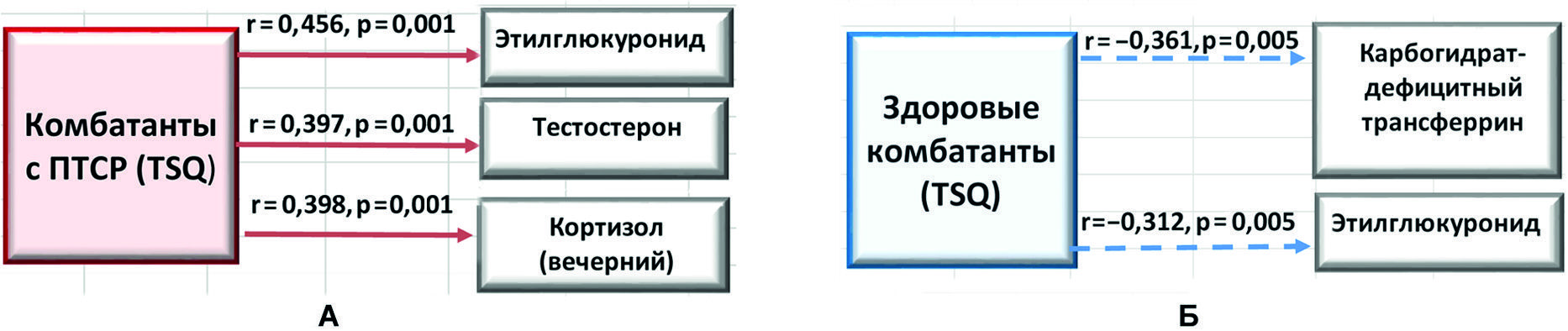 При изучении связей с использованием коэффициента ранговой корреляции Спирмена между данными ПТСР и уровнем этилглюкуронида, тестостерона и вечернего кортизола выявлено наличие положительных достоверных взаимосвязей в 1-й группе комбатантов (рисунок, А). Во 2-й группе комбатантов обнаружены отрицательные достоверные взаимосвязи между данными ПТСР и уровнем этилглюкуронида и карбогидрат-дефицитного трансферрина (см. рисунок, Б), что означает наличие у них меньшего риска чрезмерного употребления алкогольных напитков.