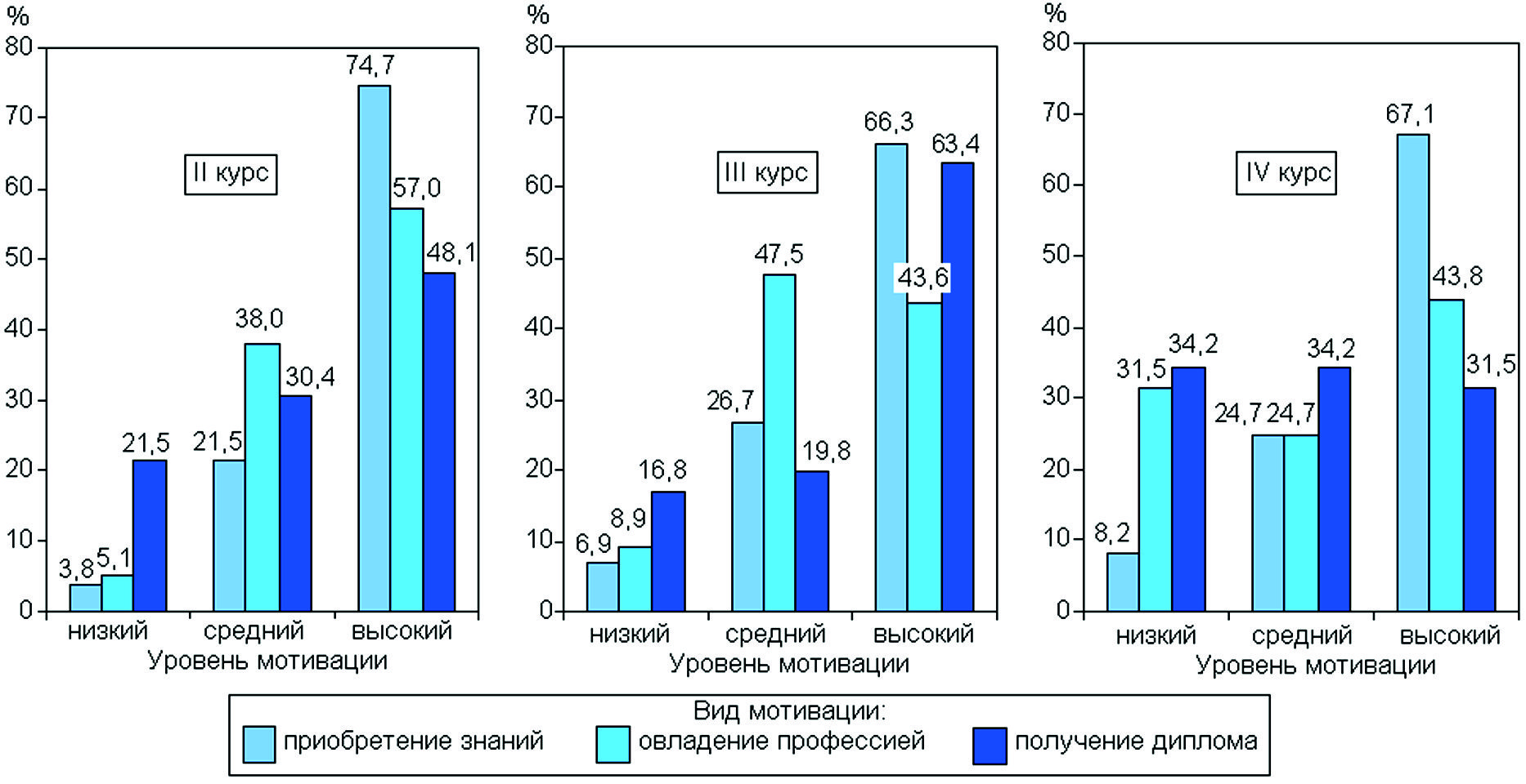 Студенты по методике Т.И. Ильиной (суммированные баллы) условно были поделены на группы с низкой, средней и высокой степенью мотивации к приобретению знаний, овладению профессией и получению диплома. Данные, представленные в таблице, позволили оценить уровни видов мотивации у студентов по курсам обучения (рисунок).