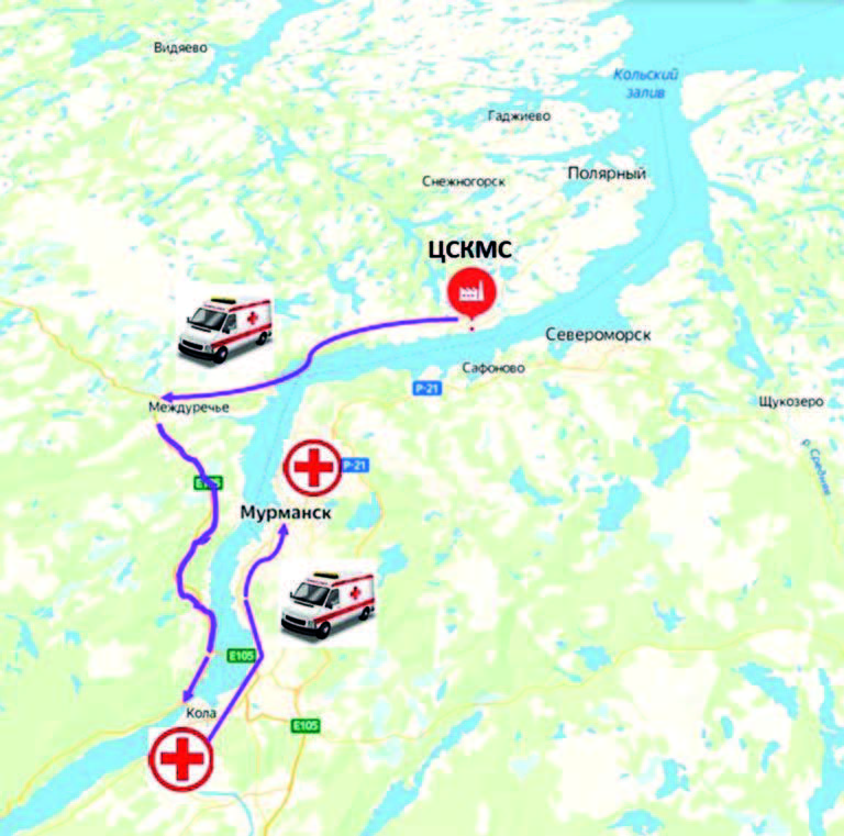 При необходимости оказания специализированной медицинской помощи проводится плановая и экстренная медицинская эвакуация вахтовых работников в региональные учреждения здравоохранения. Для строительной площадки в пос. Белокаменка базовыми медицинскими учреждениями для оказания специализированной медицинской помощи являются Мурманская областная клиническая больница им. П.А. Баяндина, Мурманский областной клинический многопрофильный центр, резервным – Кольская центральная районная больница (ЦРБ). Медицинскую эвакуацию в эти медицинские учреждения осуществляют собственным санитарным транспортом, имеющимся на строительной площадке, либо силами и средствами Мурманской областной станции скорой медицинской помощи. Маршрут медицинской эвакуации со строительной площадки в пос. Белокаменка в медицинские учреждения г. Мурманска представлен на рис. 1.
