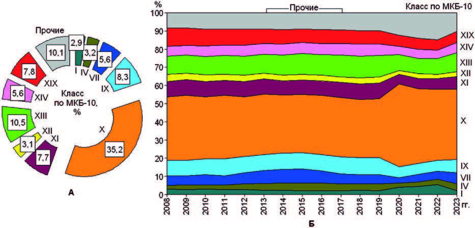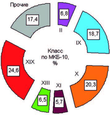 При анализе болезней по МКБ-10 акцент делали на классы, показатели которых имели вклад в структуру не менее 3 %, отдельных болезней (групп в классах) – не менее 0,1 %.