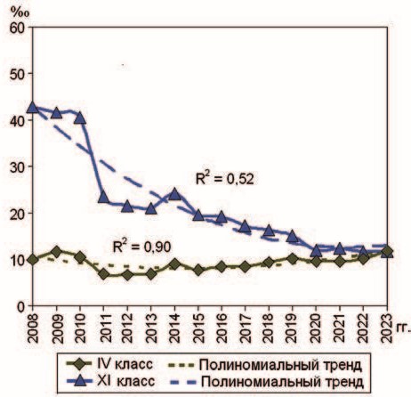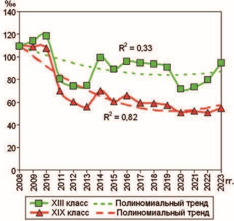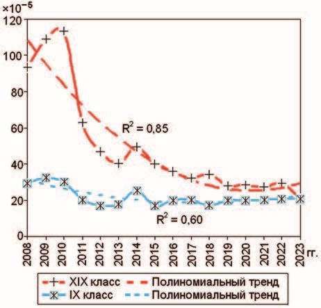 На рис. 28, 29 показана динамика смертности сотрудников по ведущим классам болезней. При высоких коэффициентах детерминации полиномиальные тренды уровней смертности от новообразований (II класс) и травм, отравлений и некоторых других последствий воздействий внешних причин (XIX класс) демонстрировали снижение показателей, от болезней системы кровообращения (IX класс) и органов пищеварения (XI класс) – напоминали U-кривые с увеличение показателей в последний период наблюдения.