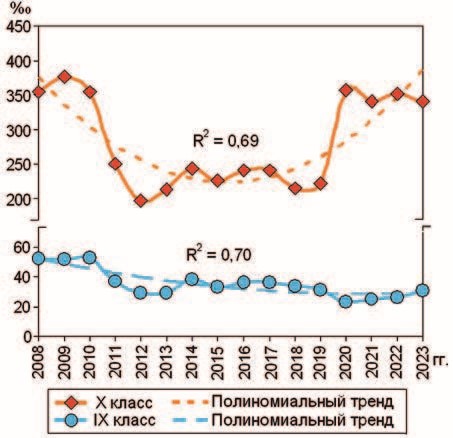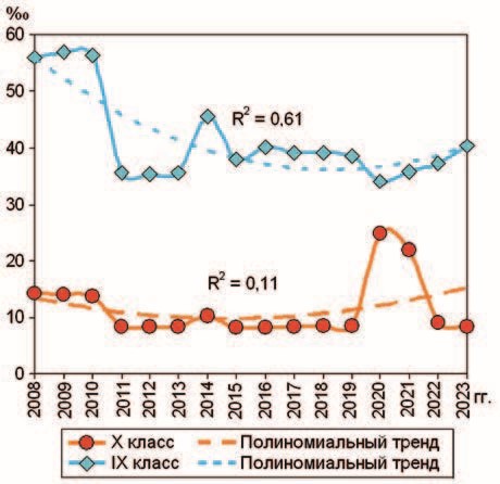 Динамику показателей оценивали с помощью анализа динамических рядов и расчета полиномиального тренда второго порядка [15]. Коэффициент детерминации (R2) показывал связь построенного тренда с данными, чем больше был R2 (максимальный 1,0), тем больше приближался он к объективным данным. Значок ↑ в таблицах показывает тенденцию роста динамики данных, ↓ – уменьшение, → – стабильности, – U-кривую, – инвертируемую U-кривую. В ряде случаев правый край тренда был больше (меньше) левого, в этом случае к U-кривой добавляли знаки ↑(↓).