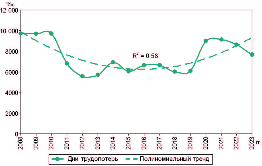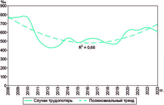 Среднемноголетний показатель общей заболеваемости составил 857,1 ‰, средний – (868,5 ± 35,7) ‰, первичной заболеваемости – 545,7 ‰ и (553,6 ± 27,5) ‰, нуждаемости в диспансерном наблюдении –123,8 ‰ и (125,9 ± 7,5) ‰, случаев трудопотерь – 572,4 ‰ и (576,1 ± 28,5) ‰, дней трудопотерь – 7398 ‰ и (7506 ± 391) ‰, первичной инвалидности – 10,9 • 10–4 и (11,1 ± 1,3) • 10–4, смертности – 90,1 • 10–5 и (92,4 ± 9,9) • 10–5. При высоких коэффициентах детерминации полиномиальные тренды общей заболеваемости, первичной инвалидности показывают уменьшение данных, первичной заболеваемости, случаев и дней трудопотерь напоминают U-кривую с увеличением показателей за счет случаев заболеваемости COVID-19 в 2020–2022 гг.