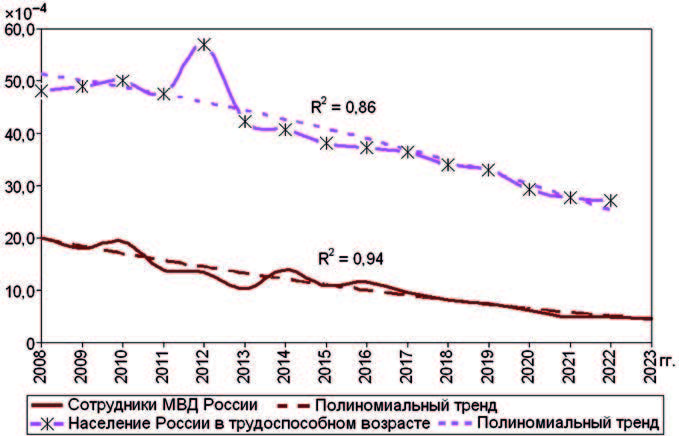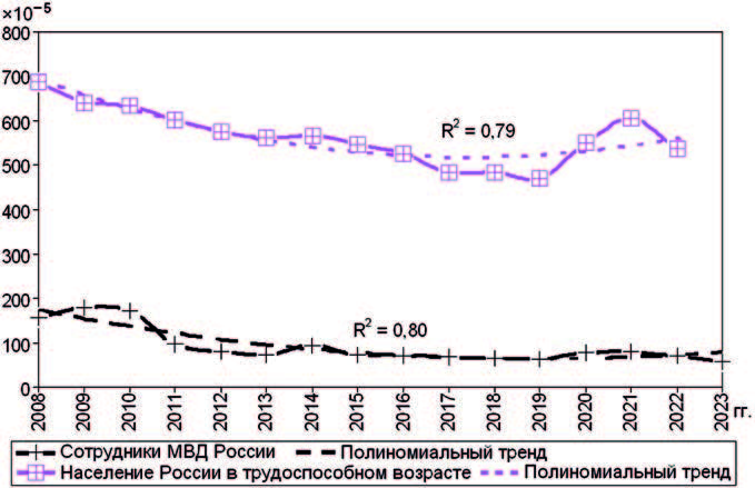 Results and analysis. The long-term average rate of general morbidity was 857.1 ‰ (868.5 ± 35.7 ‰), primary morbidity – 545.7 ‰ (553.6 ± 27.5 ‰), outpatient follow-up – 123.8 ‰ (125.9 ± 7.5 ‰), loss of workforce – 572.4 (576.1 ± 28.5 ‰), days out of work – 7398 ‰ (7506 ± 391 ‰), primary disability – 10.9 • 10–4 (11.1 ± 1.3 •10–4), mortality – 90.1 • 10–5 (92.4 ± 9.9 • 10–5). With high coefficients of determination, polynomial trends in overall morbidity, primary disability and mortality show a decrease in data, primary morbidity, loss of workforce and days out of work resemble a U-curve, showing an increase in indicators due to COVID-19-associated morbidity cases in 2020–2022. The indicators for injuries, poisoning and some other consequences of externally caused disorders (Chapter XIX) represented the main chapters of diseases that – with a share of 24.6% – were the key contributors to the social and epidemiological significance of morbidity among the personnel of the Ministry of Internal Affairs of Russia, followed by respiratory diseases (Chapter X) – 20.3 % , circulatory system disorders (Chapter IX) – 18.7 %, neoplasms (Chapter II) – 6.8 %, musculoskeletal system and connective tissue diseases (Chapter XIII) – 6.5 %, digestive disorders (Chapter XI). In total, these сhapters of diseases accounted for 82.3 % of the entire social and epidemiological significance of morbidity.
